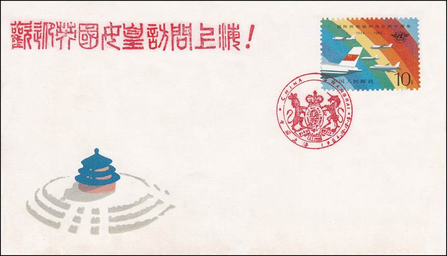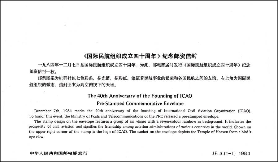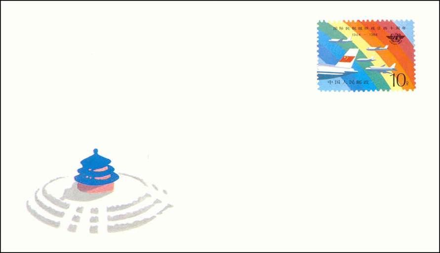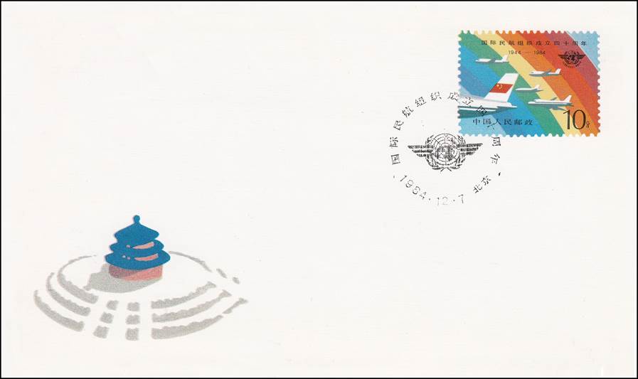 China – 7 December 1984. Postal stationery (JF.3.). Designer: Wan Weisheng. Stamp of 10fen, showing a group of five airplanes with seven‑colour rainbow as background and ICAO emblem; it indicates the prosperity of civil aviation and signifies the friendship among aviation administrations of various countries of the world. The cachet on the envelope depicts the Temple of Heaven from a bird's eye view. The Temple of Heaven, literally the Altar of Heaven (simplified Chinese: 天坛; traditional Chinese: 天壇) is a complex of religious buildings situated in the southeastern part of central Beijing.