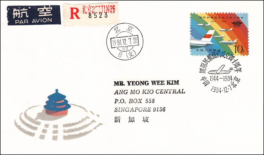 Circulated cover, with postmark dated 7 December 1984. The text in the postmark is translated as follows: Upper-side: The 40th anniversary of the International Civil Aviation Organization 国际民用航空组织四十周年 Lower-left: China 中國 Lower-right: Beijing 北京.