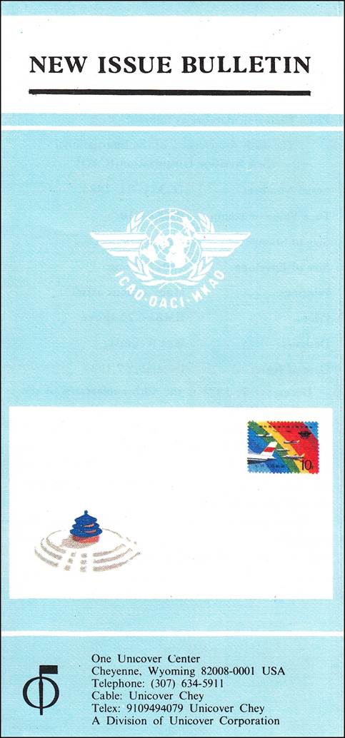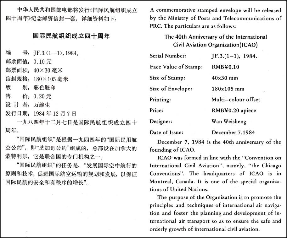 China - Philatelic notice Two errors in the English text: 1) the Chicago Conventions must be written: the Chicago Convention (singular form); 2) ICAO is not a specialized organization of the UN, but rather a Specialized Agency.