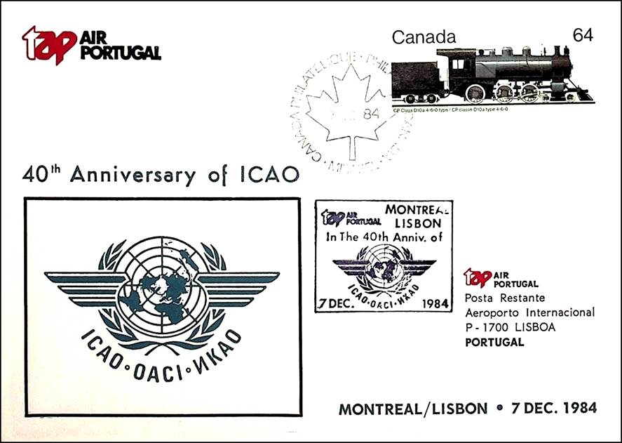 Portugal - 40th Anniversary of ICAO. Flight Cover - 7 December 1984. Carried by TAP (Transport Air Portugal), between Montreal, Canada and Lisbon, Portugal. Philatelic cancel at departure airport: Mirabel, QC, Canada. Stamp: 64-cent issued on 25 October 1984, Canadian Pacific D10a steam locomotive. |