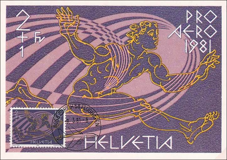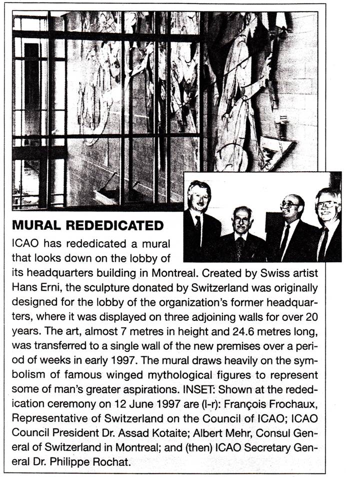 works have been The picture of Icarus, used on the stamp project was adapted from the spectacular mural entitled Man in Flight, commissioned by Switzerland from Hans Erni. The mural was originally designed for the entrance lobby to the ICAO Headquarters Building at 1000 Sherbrooke West and installed there in 1975 when ICAO moved to this location; the mural initially covered three sides of the main elevator core of the building. Currently on the main wall above the entrance in ICAO lobby in Montréal, Canada, the mural in anodized aluminum consists of four stories depicting man’s endeavours and excursions into space. The central figure of the mural is Daedalus flying towards the sun. His son Icarus is not shown; a circular web with splashes symbolizes the sun. To the left of Daedalus, the profile of a woman represents Adriadne, the daughter of King Minos. To the right of Daedalus, is the winged horse, which stamped the rock of Mount Helicon with its hoofs. To the extreme right, the artist has shown the modern man in the classic pose of “Man the Thinker”, with his tools and instruments of modern technology.