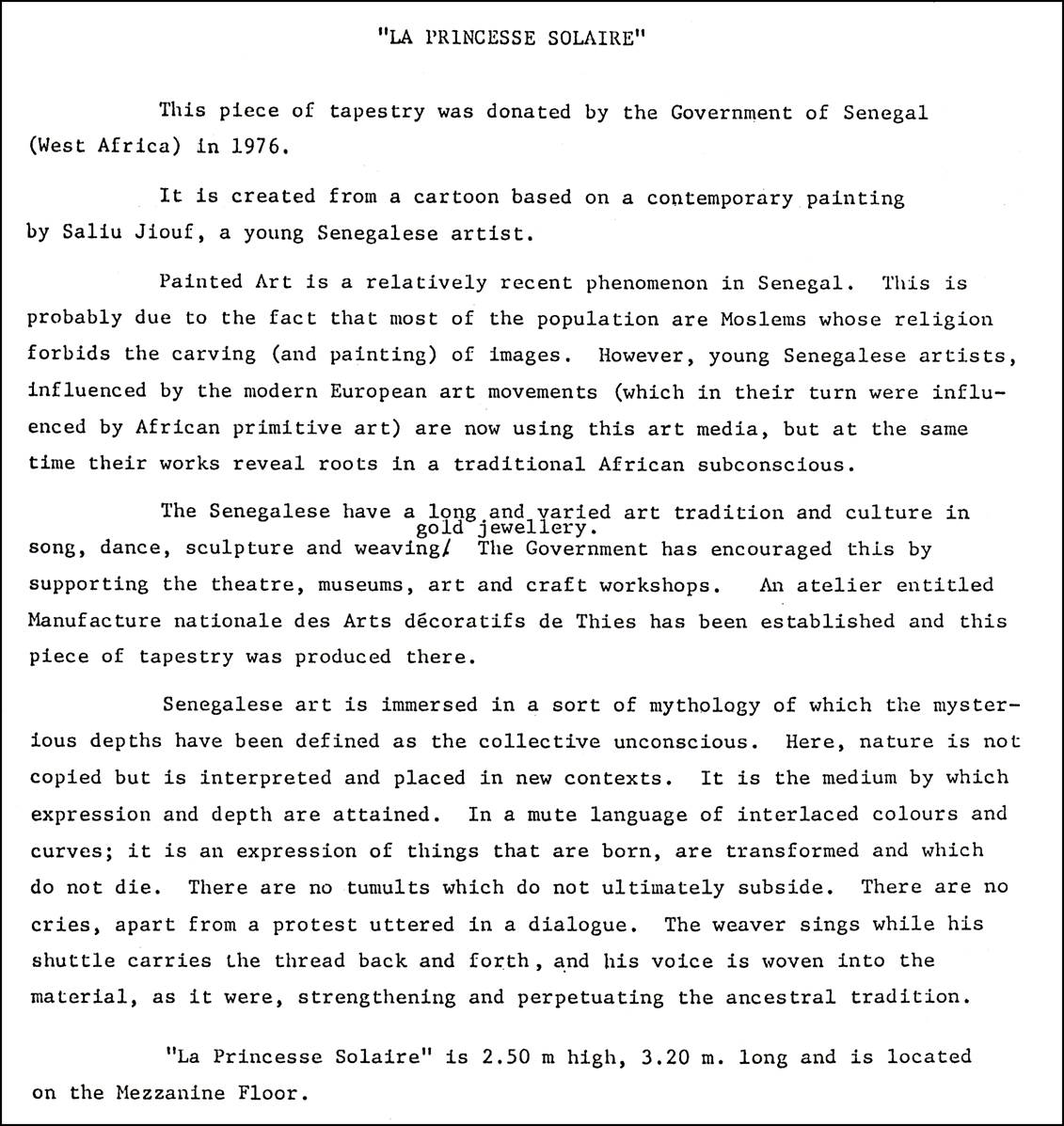 2. The Solar Princess tapestry. The Solar Princess or Sunshine Princess (La Princesse Solaire) tapestry (2.5m high, 3.2m long) was designed by the Senegalese artist Sadiou Diouf Démangui and is a masterpiece of Senegalese art. It is located in the spacious lounge of the conference block at ICAO Headquarters in Montréal, in front of the second largest conference room of the building. The Government of Senegal donated the tapestry; it was presented to ICAO on 23 June 1976 by Léopold Sédar Senghor, the President of the Republic of Senegal, on the occasion of his visit to the Headquarters of the Organization. The tapestry is characterised by a black background upon which a sun in geometric shape looms. It consists of brightly colored circles, triangles and rectangles; it lights up a stylised landscape depicting a woman’s profile. Senegalese