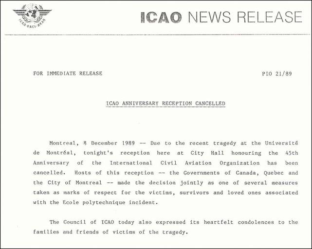 In December 1989, ICAO planned to celebrate its 45th anniversary. Celebrations had to be cancelled further to the École Polytechnique Massacre, also known as the Montréal Massacre, occurred on 6 December 1989, at the École Polytechnique in Montréal (an engineering school affiliated with the Université de Montréal), Québec, Canada. See ICAO’s News releases hereafter.