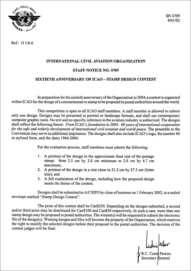 Through the Staff Notice SN 4709 dated 9 January 2002, a contest was launched for the design of a commemorative stamp marking the 60th anniversary of ICAO, open to all ICAO staff members. Unfortunately, prizes of this contest were never distributed.