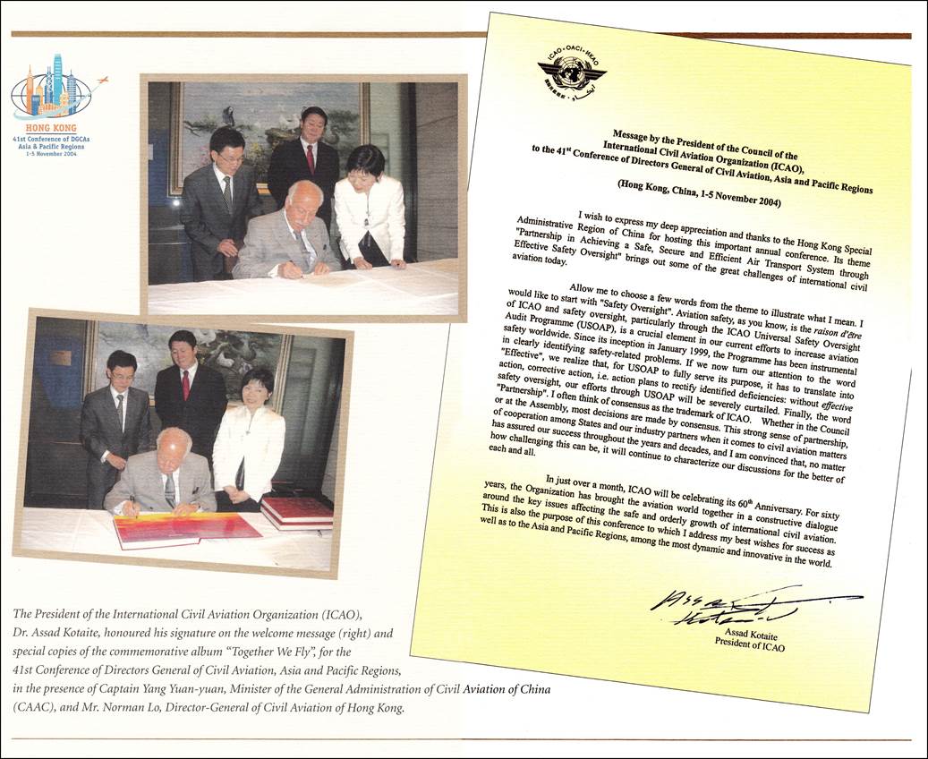 Dr. Assad Kotaite, ICAO’s President, signed the welcome message (see here-above) and special copies of the commemorative album issued by Hong Kong on the occasion of the 41st Conference of the Directors General of Civil Aviation, Asia and Pacific Regions, held in Hong Kong, China, from 1 to 5 November 2004.