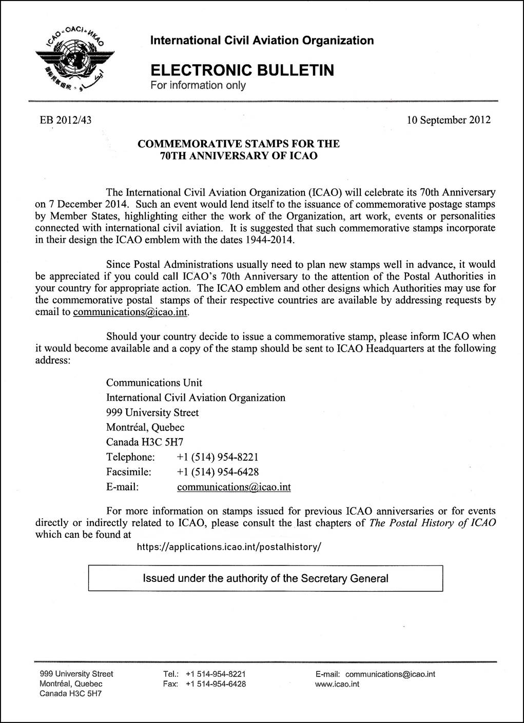 Electronic Bulletin EB 2012/43 related to ICAO’s 70th anniversary |
