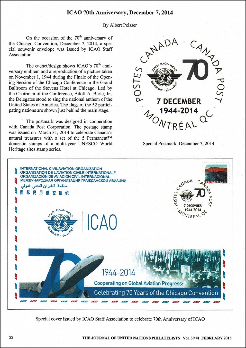 Special souvenir cover prepared by ICAO’s Staff Association for the 70th anniversary of ICAO. Celebrating 70 Years of the Chicago Convention was the theme of 2014 International Civil Aviation Day (ICAD).