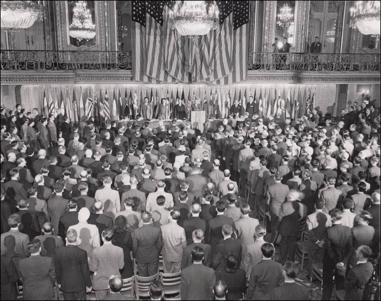 1 November 1944 – Finale of the Opening Session of the Chicago Conference in the Grand Ballroom of the Stevens Hotel, Chicago. The representatives of the 52 participating nations stand to sing the Star-Spangled Banner (the national anthem of the United States), led by the Chairman of the Conference, Adolf A. Berle, Jr. |
