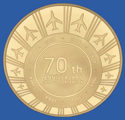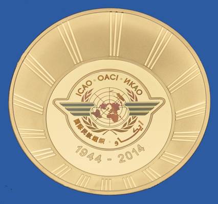 On the occasion of its 70th anniversary, ICAO requested the Banknote Printing and Minting Works of the National Bank of Ukraine to mint 1000 medals commemorating this landmark diplomatic event in ICAO’s history. The hologram on the back was produced by Specialized Enterprise Holography Ltd, a highly technological manufacture of security holograms established in Ukraine.