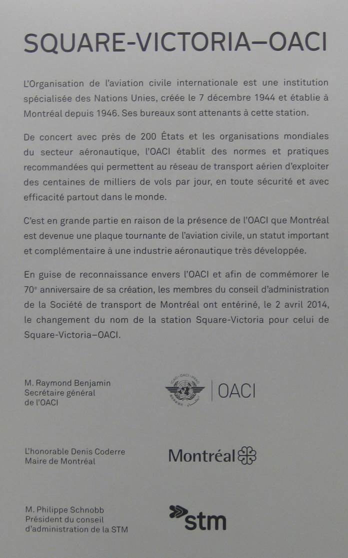 Following the adoption of a resolution by the Board of Directors of the Montreal Transit Corporation (STM) on 2 April 2014, the name of the metro station Square-Victoria was changed to Square-Victoria-ICAO. Due to the presence of the International Civil Aviation Organization, Montréal has become a major hub of civil aviation, a highly significant status for a metropolis with a well-developed industry. To mark the beginning of Montréal activities surrounding the 70th anniversary of the signing of the Chicago Convention and the establishment of the International Civil Aviation Organization, the City of Montréal and the Société de transport de Montréal (STM) announced on 14 November 2014 the official renaming of Metro Station Square-Victoria to Metro Station Square-Victoria-OACI; a commemorative plaque marking the importance of ICAO’s presence in Montréal was unveiled during the ceremony.