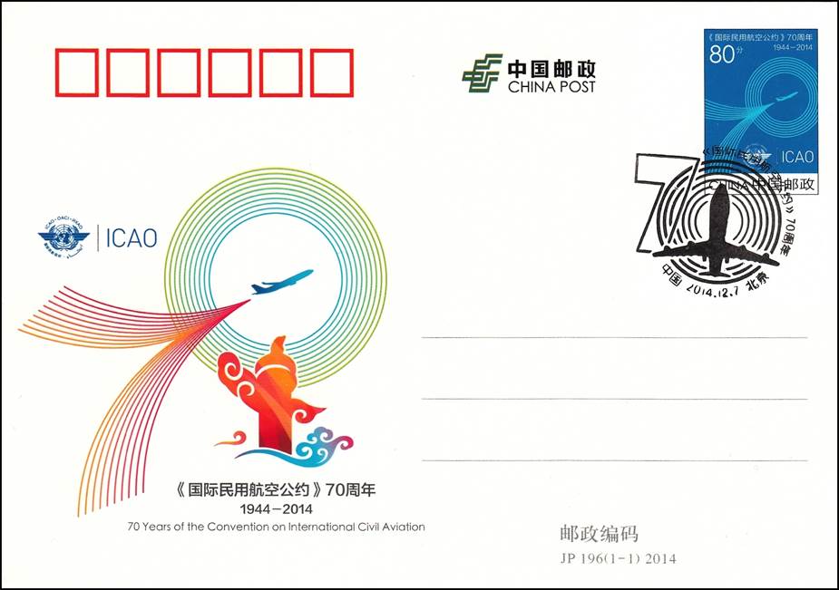 In December 2014, China released a postal stationery card (stamped) related to the 70th anniversary of ICAO, with number JP196. In 2014, China’s Post Office issued a total of 14 postal cards (JP183-JP196) and 4 postal envelopes (JF112-JF115). For reference purposes, JF3 postal envelope was released by China on 7 December 1984 for the 40th anniversary of ICAO (see details at the following link: The 40th Anniversary).