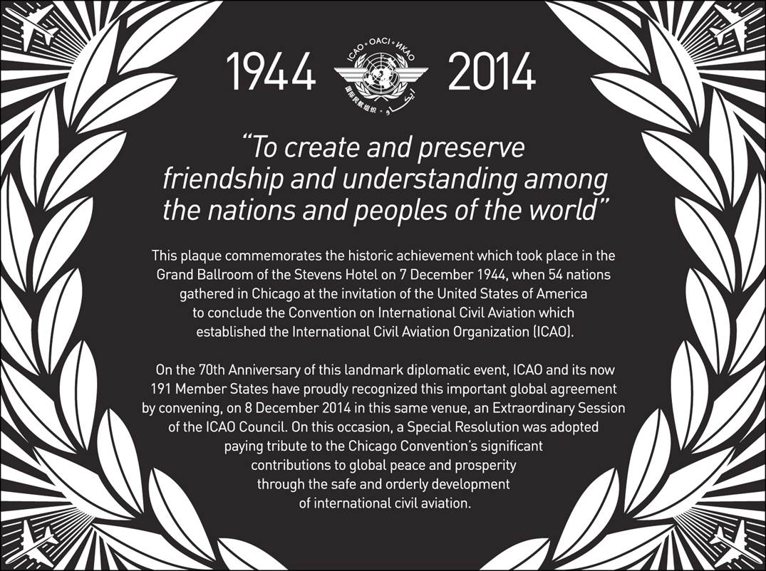 A commemorative plaque was unveiled during the Extraordinary Session of the ICAO Council held in Chicago on 8 December 2014. This plaque can now be seen in the ICAO Museum (see 2nd picture).