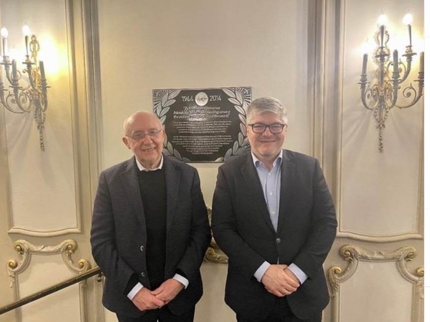 A second copy of the 70th anniversary commemorative plaque is hanging at the Chicago Hilton Hotel. The President of the Council Mr. Salvatore Sciacchitano (left) and the Secretary General Mr. Juan Carlos Salazar (right) are standing in front of this plaque during the 80th anniversary celebrations at the Hilton on 4-5 December 2024.