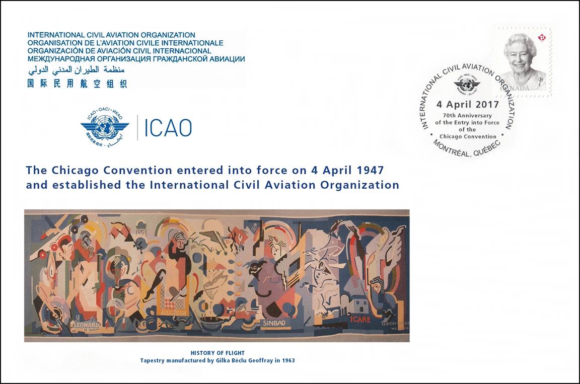 First Day Cover commemorating the 70th Anniversary of the Entry into Force of the Chicago Convention on 4 April 2017. The History of Flight tapestry with half cross stitch in colored wool was woven in 1963 by Gilka Blécu Geoffray at the Gobelins manufacture. It is based on a cartoon by Jacques Villon (1875-1963) who derived the composition from four pictures painted in 1939-1940 by Albert Gleizes (1881-1953). In 1960, the French Painter Albert Voisin (also named Vanber, 1905-1994) was charged by Gleize’s spouse to create the tapestry box for the Gobelins manufacture. Portrayed are four persons of legend and history connected with flight: Leonardo da Vinci, Aladdin, Sinbad and Icarus. Signed at the lower-right: Gleizes – Gilka / Wander. Size: 140x430cm. It was offered in 1975 by France to ICAO and is now exhibited at Headquarters, Montréal in the Conference Center. The Gobelins factory wove a second copy, which supposedly is at the Rochefort Air Force School. |