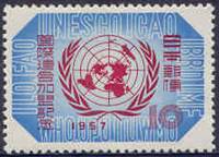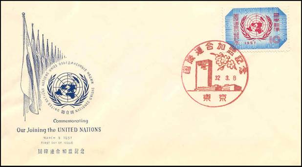 Japan's admission to the UN 8 March 1957 Official emblem of the UN surrounded by the initials of ten UN Agencies (including ICAO at the top right) |