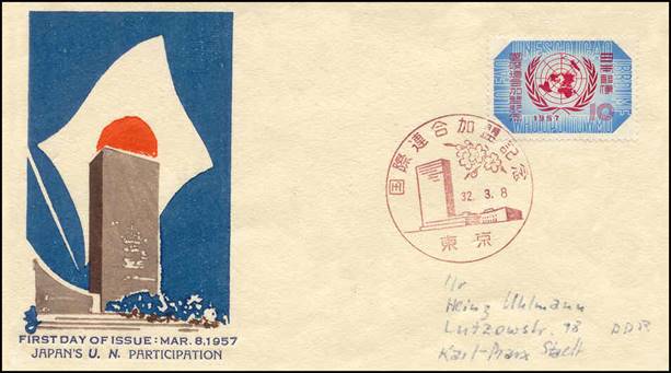 Japan - 8 March 1957 First day cover - Admission to the UN UN headquarters in New York and Japanese flag in the background