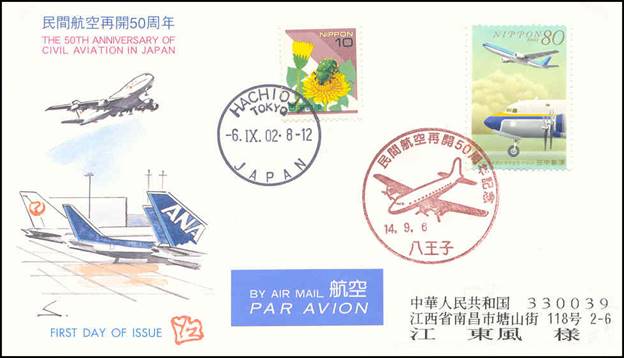 Japan - 6 September 2002 First day cover commemorating the 50th anniversary of civil aviation. Heisei 14 corresponds to the year 2002.