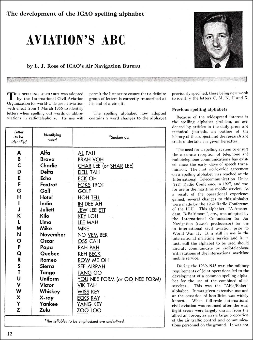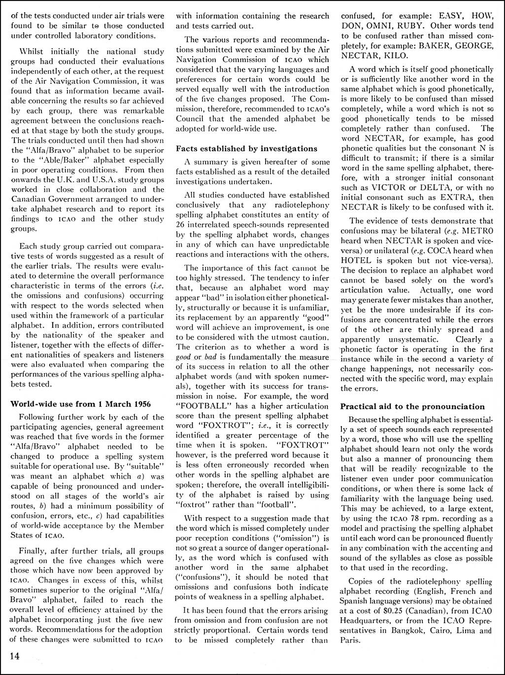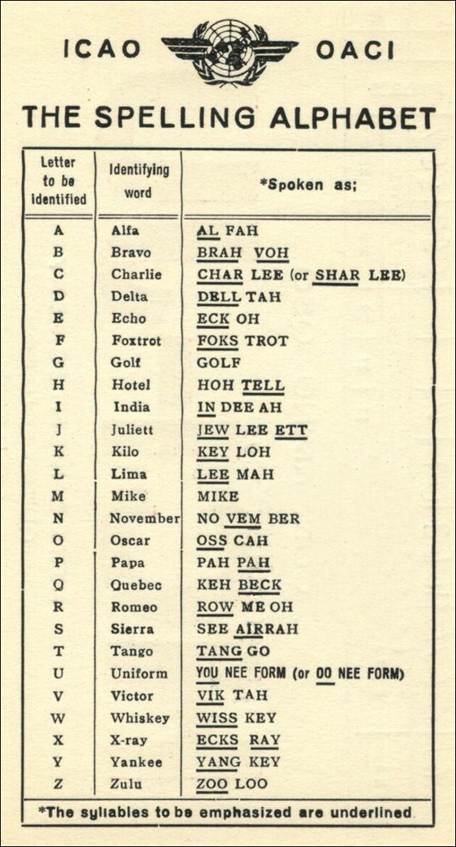 During 1948 and 1949, Professor Jean-Paul Vinay of the Université de Montréal, Canada worked on the problem in collaboration with the ICAO Language Section. Sounds, words and whole alphabets were tested and, as a result, principles were formulated to govern the selection of words. After those studies, consultations with communications experts and comments from all of ICAO’s member governments, a new ICAO alphabet was adopted and incorporated in the Aeronautical Telecommunications Annex 10 for implementation on 1 November 1951 in civil aviation, with one-year transition to this new alphabet: Alfa Bravo Coca Delta Echo Foxtrot Golf Hotel India Juliett Kilo Lima Metro Nectar Oscar Papa Quebec Romeo Sierra Tango Union Victor Whisky Extra Yankee Zulu.