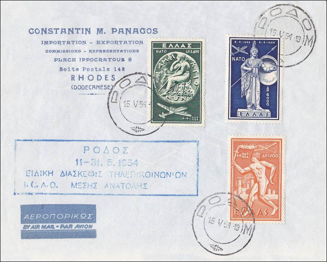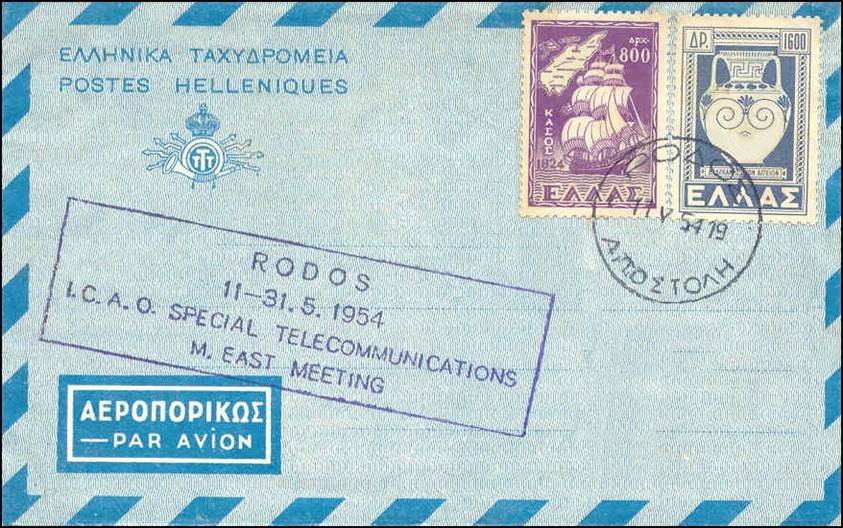 First Day Cover - Special Middle East Communications Meeting. Rhodes, Greece - 11 to 31 May 1954. Violet cancels. This Meeting was called to consider among other items for the region: 1) proposals to amend the interim and final aeronautical fixed telecommunications network (AFTN) plans in the light of changing operational requirements; 2) proposals to amend the operational requirements for radio navigation aids in the light of recent developments in air operations; 3) review of progress of implementation of the regional plan for very high frequency communications in the aeronautical mobile service.