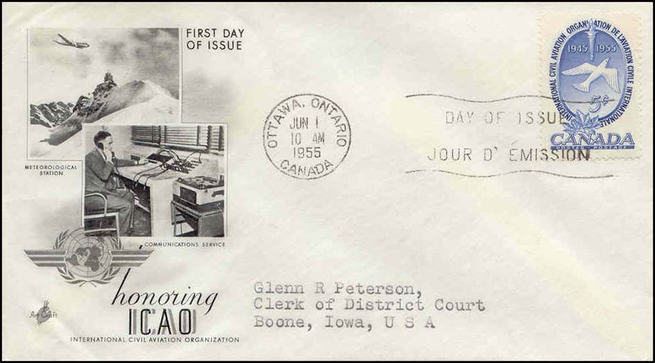 Canada – 1 June 1955 – First Day Cover 10th Anniversary of the interim Agreement and first PICAO Meeting Picture representative of a Communications Service, showing a Monitor Control Unit which provides facilities for an instructor to monitor any selected or all operating circuits in the complete trainer; a tape recorder either records anyone selected circuit or may inject any prefabricated instructional material into any selected or all circuits in the system. The Monitor Control Unit was part of a Synthetic Air Traffic Communications Trainer, displayed at ICAO headquarters during the Personnel Licensing Division (held from 22 January to 14 February 1952) and designed by the US Civil Aeronautics Administration and ICAO; it could be shipped to any section of the world where ICAO training assistance teams (within the framework of the UN Expanded Programme for Technical Assistance) would train local personnel in the operation of modern aerodrome equipment.