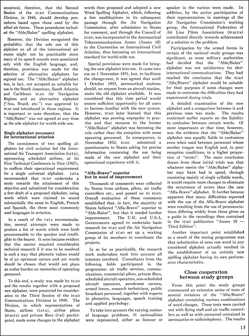 The coexistence of two spelling alphabets led IATA at its First Technical Conference in Nice in 1947 to submit for consideration by ICAO a first draft of a proposed single universal alphabet that had sounds common to English, French, Spanish and Portuguese.
