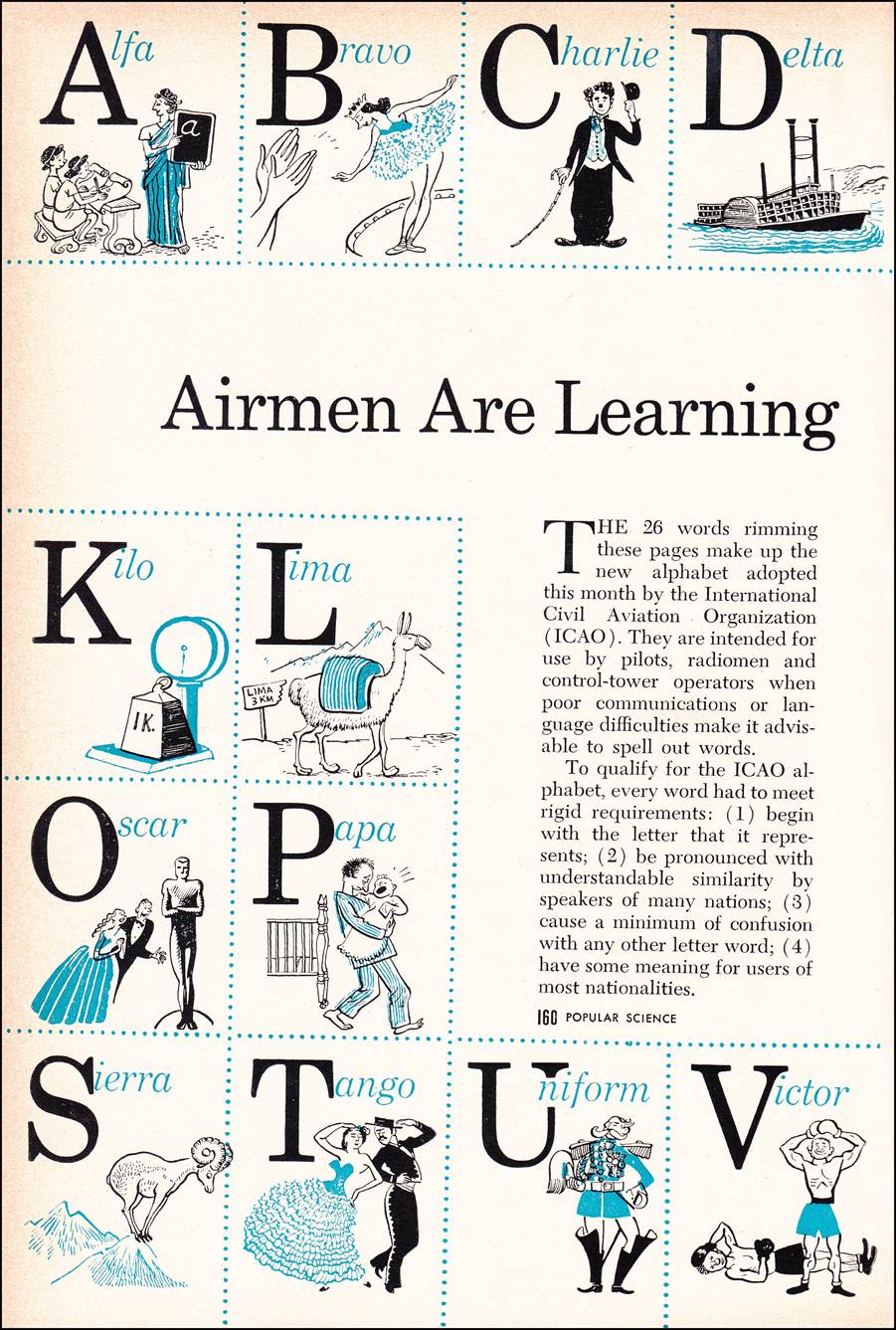 Creator/Publisher: Popular Science - March 1956 Edition, pages 160 and 161. Approximate Size (inches): 6 x 9. This is an original two-page two-colour print article about the airmen's alphabet for pilots that was developed by ICAO and illustrated through a series of cartoons by Artist Carl Rose. Carl Rose (1903 – 1971) was an American cartoonist whose work appeared in The New Yorker, Popular Science, The Saturday Evening Post, and elsewhere.