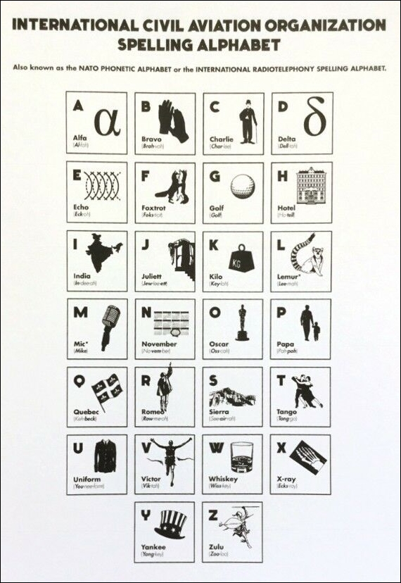 ICAO Spelling Alphabet with pictograms associated to each letter. Note two errors: 1) The letter “L” must be associated to the codeword Lima; 2) The letter “M” must be associated with the codeword Mike. Apparently, an adaptation from the original ICAO phonetic alphabet was made to assist visual recognition for these two letters!