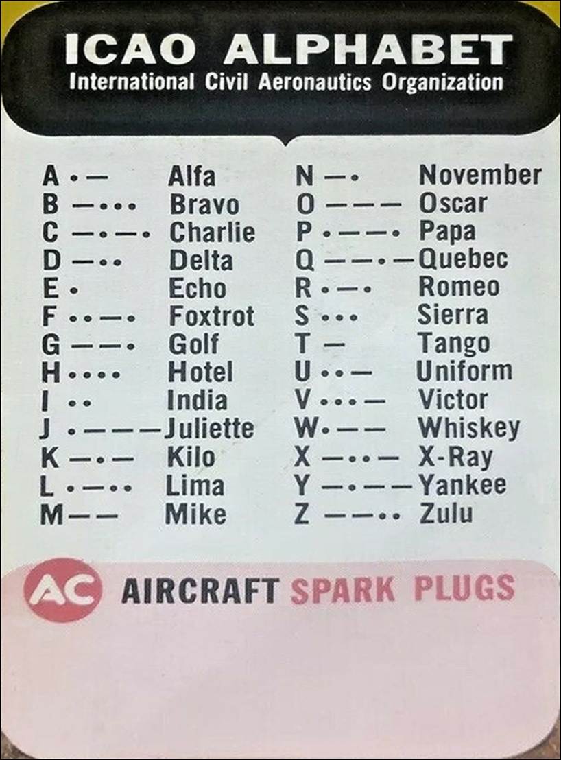 Vintage Spark Plug Aircraft ICAO Alphabet Sticker. Note the error in the name of the Organization: “Aeronautics” should have been “Aviation”. |
