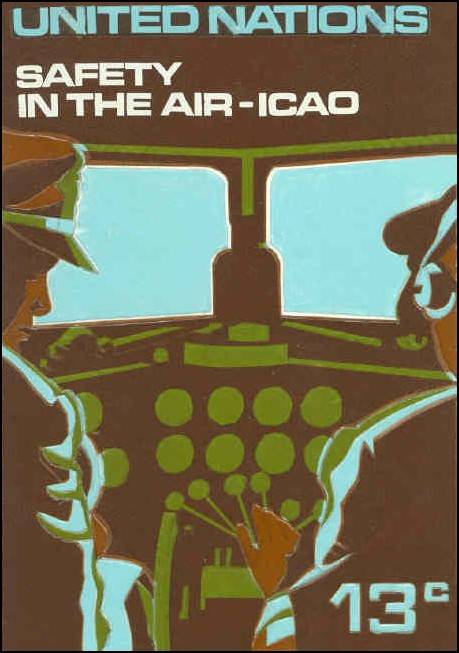 United Nations – 12 June 1978 ICAO Safety in the Air Artist’s drawing of proposed (and not selected) design by Olav Mathiesen, Denmark: Pilots in the cockpit of an airplane. Olav Mathiesen designed the United Nations New York Souvenir Card #11 issued on 11 March 1977 (World Intellectual Property Organization and specialized Agencies commemorated by UN postage stamps). |