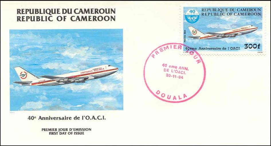 Cameroon – 30 November 1984 - 40th Anniversary of ICAO Boeing 737 of Camair in climbing position. Black (Yaoundé) and red (Douala) cancels.
