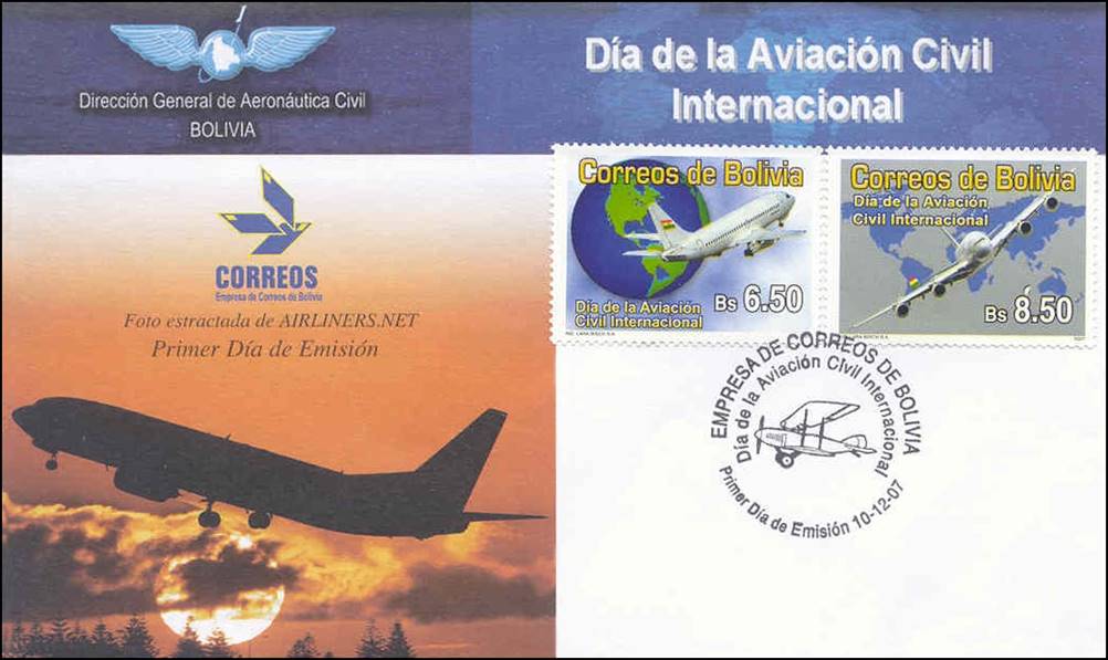 Bolivia – 10 December 2007 - International Civil Aviation Day Generic aircraft taking off into the sunset. Only 200 pieces were produced. |