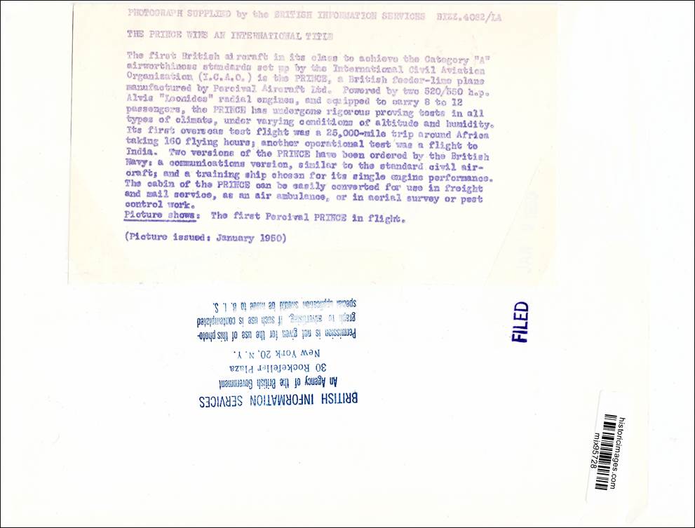 Picture dated 9 January 1950 (recto and verso). The Percival P.50 PINCE 1 (shown here, registered G-ALCM) Aircraft was manufactured by Percival Aircraft Ltd. It was a British light transport of the early postwar period, twin-engine, high-wing, cantilever monoplane of all-metal stressed-skin construction. The set of ICAO international flight standards on the airworthiness of aircraft (Annex 8) became first applicable on 1 September 1949; further to that, the PRINCE was the first British aircraft in its class to achieve the Category A airworthiness standards set up by Annex 8.