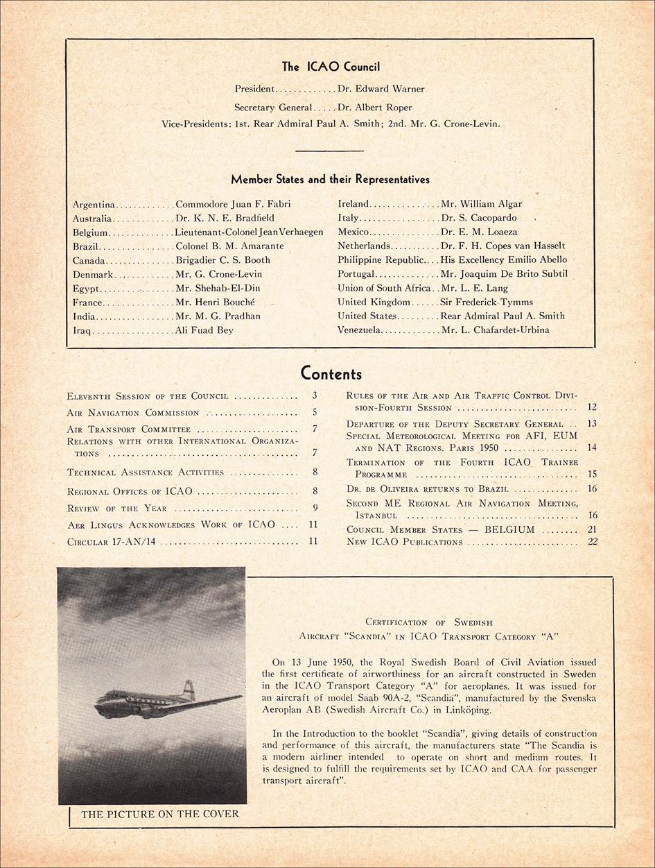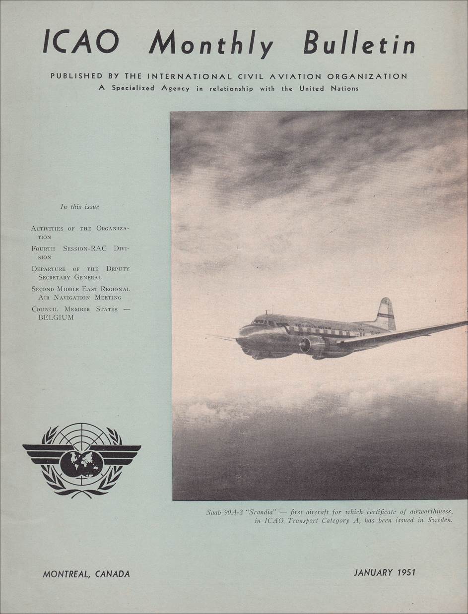 Excerpt from the ICAO Monthly Bulletin, January 1951. Front cover and first page of the Bulletin. The picture shows a Saab 90A-2 aircraft from Scandinavian Airlines System (SAS), named “Scandia” (registered SE-BSB), which received the first certificate of airworthiness in the Category “A” for an aircraft built in Sweden on 13 June 1950. Saab designed the model 90 Scandia as a DC-3 replacement with a first flight on 16 November 1946. The Scandia accommodated 24 to 32 passengers.