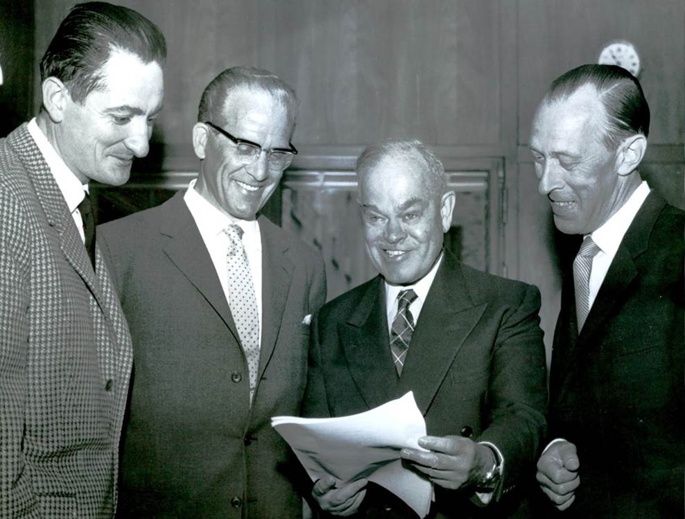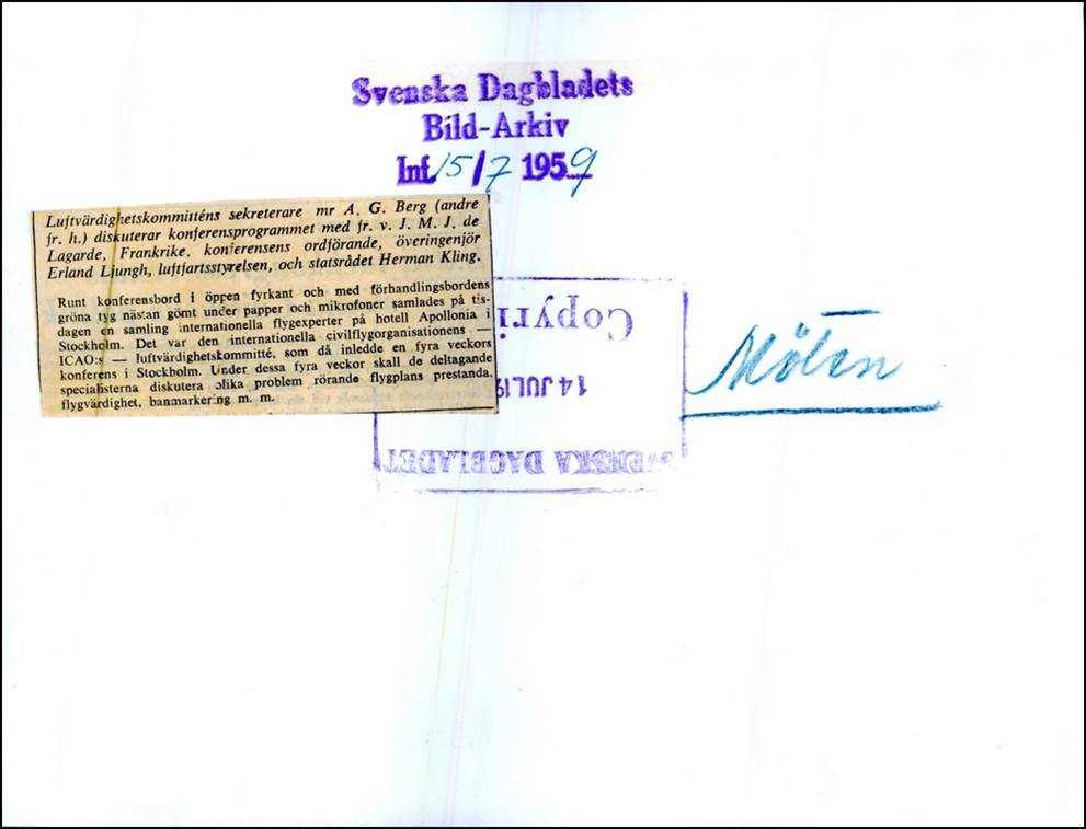 Front and back of the picture taken during the 3rd Meeting of the ICAO Airworthiness Committee, held in Stockholm from 14 July to 10 August 1959 at the Apollonia Hotel. The Secretary of the Meeting, Alfred Gordon Berg, Australia, Chief of the Airworthiness Section at ICAO, discusses the programme with the Chairman J.M.J. de Lagarde, France, the Chief Engineer Erland Ljungh, Swedish Civil Aviation Authority, and the Swedish Minister Herman Kling.