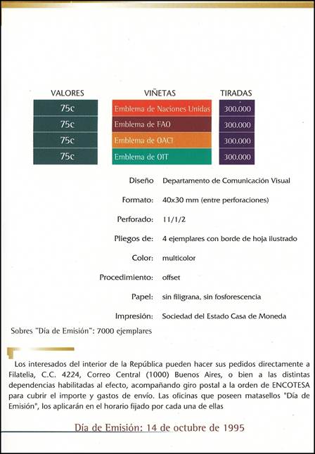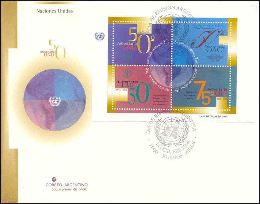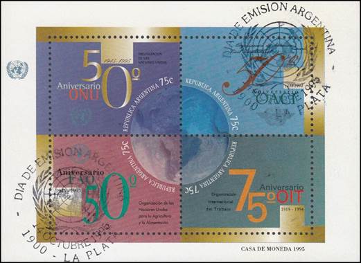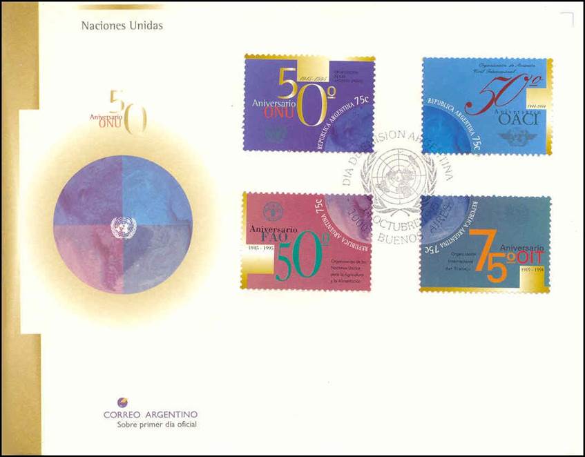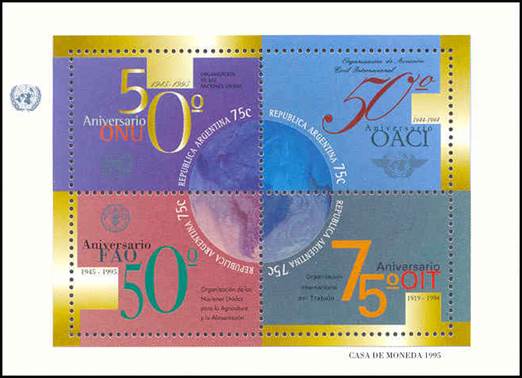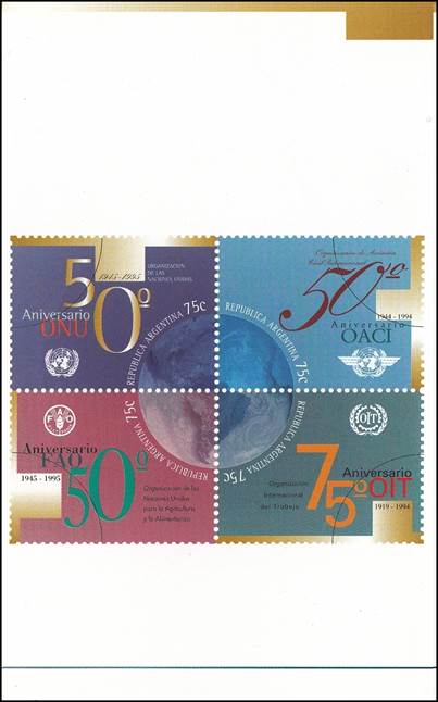 Se‑tenant block of four 75-centavo stamps forming a unified design with the earth in the centre. In addition to the 50th anniversary of the United Nations (UN), the present issue also commemorates the anniversaries of the following UN Agencies: FAO (50th anniversary in 1995), ICAO (50th anniversary in 1994, see stamp in upper-right position of the block) and ILO (75th anniversary in 1994).
