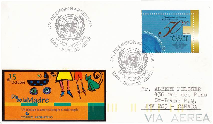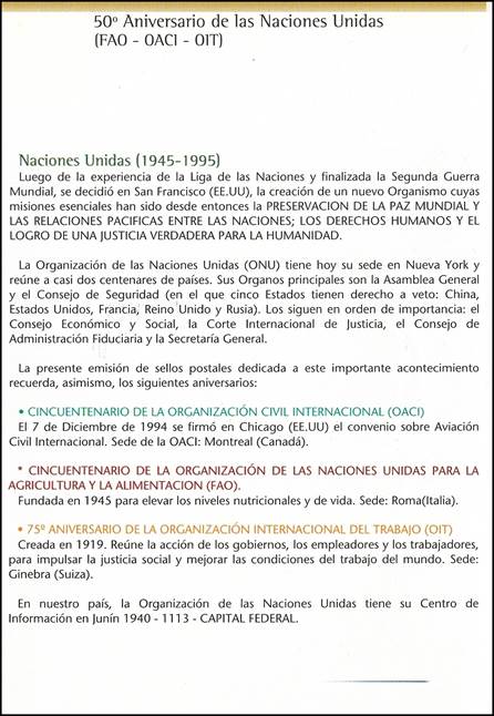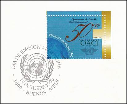 Background: The philatelic notice (see all pages below) printed by the Argentinean Postal Authority is interesting, as it shows two major errors: 1. The full name of the Organization is printed as follows: ORGANIZACIÓN CIVIL INTERNACIONAL, when the exact name is: ORGANIZACIÓN DE AVIACIÓN CIVIL INTERNACIONAL; and 2. The following paragraph reads as follows: El 7 de Diciembre de 1994 se firmó en Chicago el convenio sobre Aviación Civil Internacional. The Chicago Convention on International Civil Aviation was signed on 7 December 1944, and not in 1994.