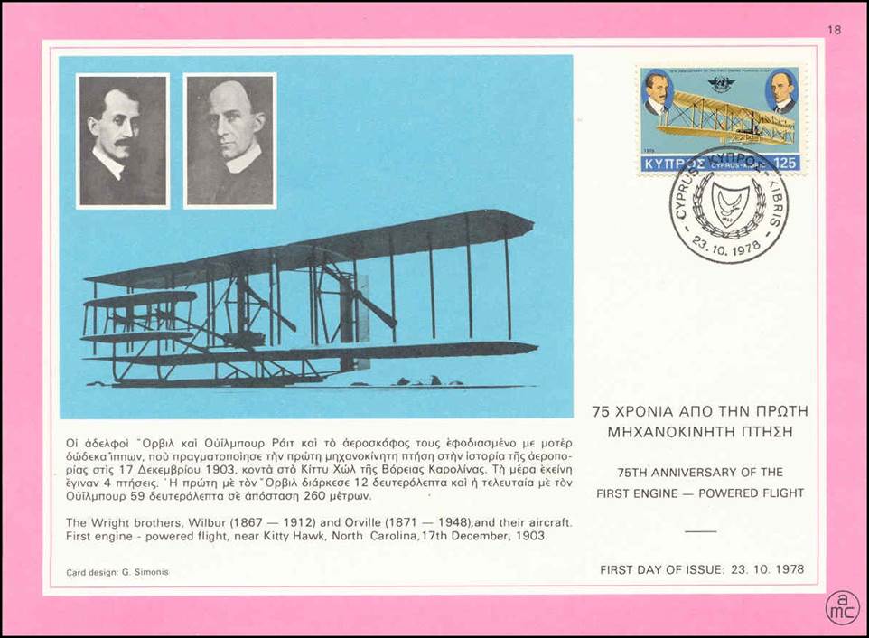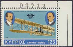 23 October 1978 – Cyprus - Anniversaries and events 1978: 75th Anniversary of first powered flight. Orville and Wilbur Wright and Wright Flyer I - ICAO emblem. Hand-stamped control number. |