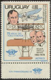 18 June 1979 – Uruguay - Anniversaries and Events: 75th Anniversary of first powered flight - 65th Anniversary of the Uruguayan air force (Fuerza Aérea Uruguaya). Wilbur and Orville Wright and Wright Flyer I (picture and upper profile) - ICAO emblem On the selvage, the designer of this stamp included the ICAO emblem, preceded by 1978 75o ANIVERSARIO DE ICAO - OACI. Uruguay inadvertently confused the 75th anniversary of the Wright brothers’ triumph on 17 December 1903, with ICAO which, even today, has not yet reached such a milestone.