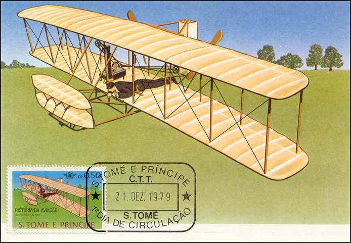 21 December 1979 - Sao Tome and Principe - Maximum card - 35th Anniversary of ICAO; history of aviation, powered flight. Wright Flyer I and ICAO emblem.