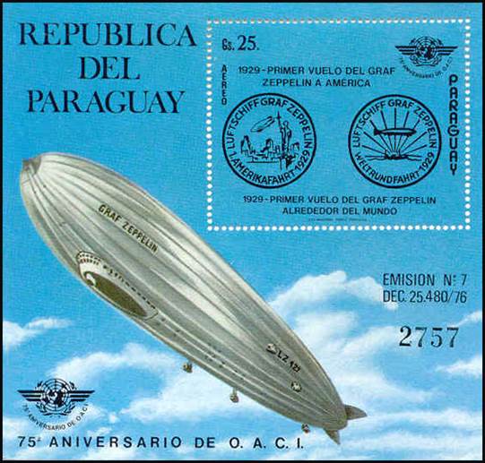 Souvenir sheet commemorating the 75th anniversary of the Graf Zeppelin airship flight around the world. It reproduces two commemorative cancels related to the Graf Zeppelin LZ 127 round-the-world flight in 1929. |