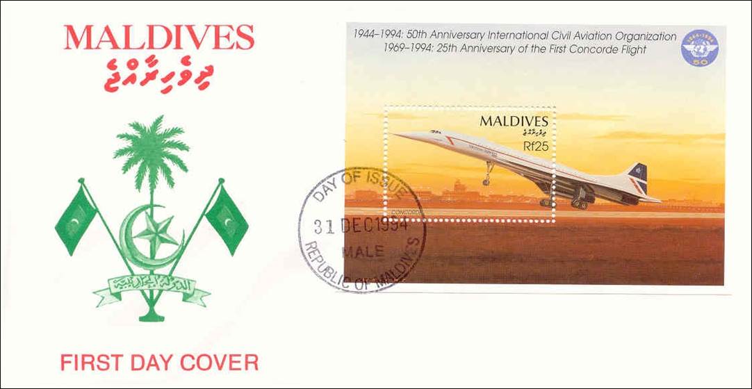First Day Cover of Maldives commemorating the 25th anniversary of the first Concorde flight and the 50th anniversary of ICAO. |