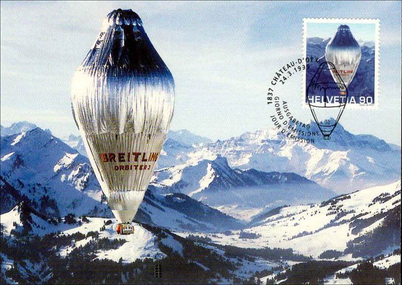 Maximum card issued by Switzerland in March 1999 to commemorate the first non-stop flight around the world by the Breitling Orbiter 3 balloon.