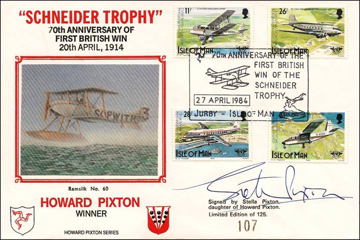 Isle of Man – 27 April 1984 – 40th Anniversary of ICAO 70th Anniversary of the first British win of the Schneider Trophy. Signed by Stella Pixton, daughter of Howard Pixton; limited edition with control number (107/125). The first day cover (with silk cachet) shows the Sopwith Tabloid in a float-equipped version which won the Schneider Trophy in 1914; the race number 3 is painted on the tail. The floatplane variant consequently became known as the Sopwith Schneider, of which 136 were built. |
