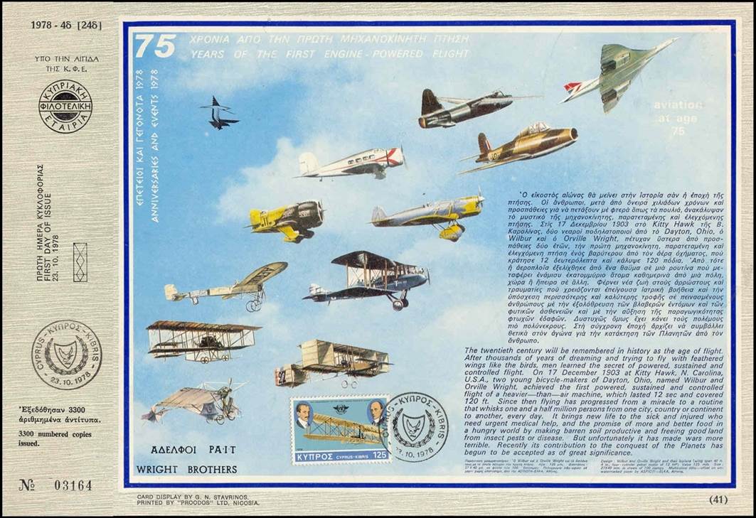 Cyprus – 23 October 1978 - 75th Anniversary of the Wright Brothers' flight First day of issue card, issued under the auspices of Cypriot Philatelic Society, with two postmarks from the post office. Numbered copy.