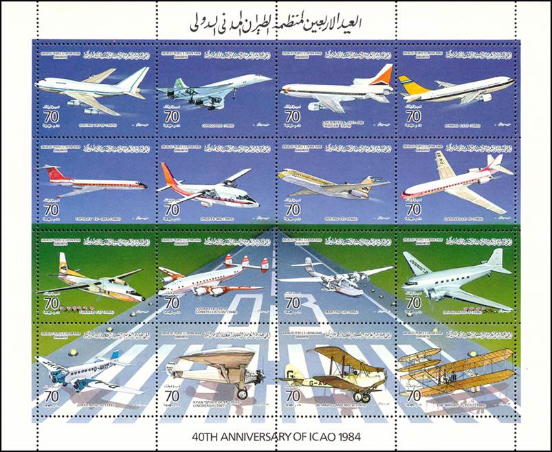 Libya - 7 December 1984 - 40th Anniversary of ICAO Sheetlet of 16 stamps, the backgrounds of the stamps forming an overall design of a runway.