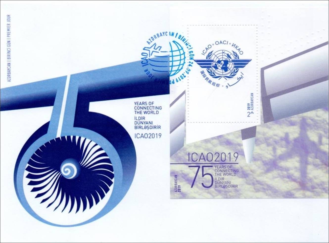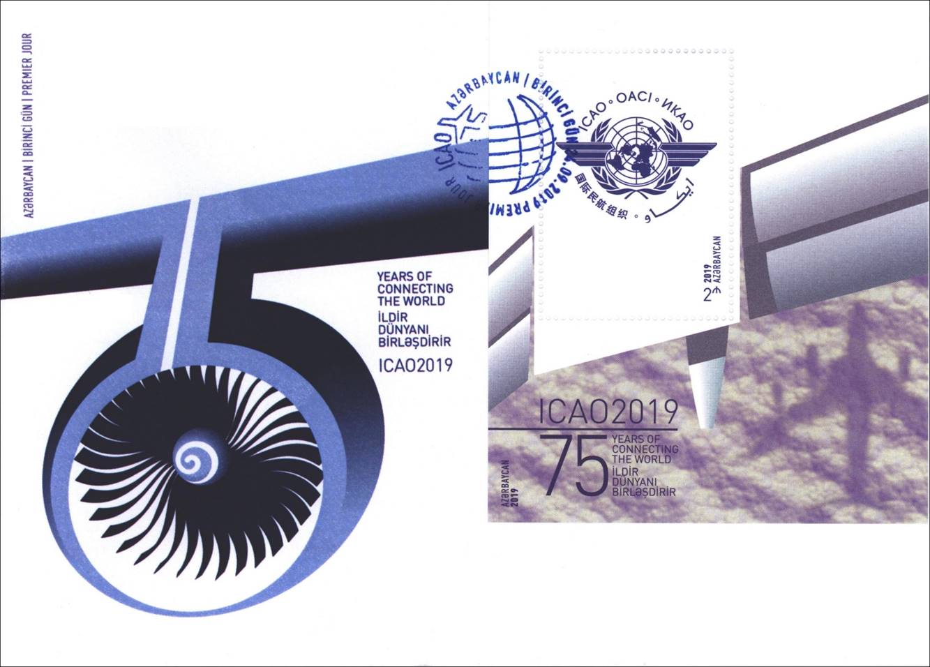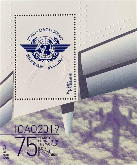 Background: Azermarka LLC operating under the Ministry of Transport, Communications and High Technologies. issued the stamp and first day cover dedicated to the 75th anniversary of the International Civil Aviation Organization (ICAO). The sheet, designed by chief graphic designer Eyyubov Vugar, was printed in the city of Bobruisk, Belarus. Azerbaijan has been a member of ICAO since 9 October 1992. For the purpose of establishment of a rotational group for elections to the Council of ICAO, the representatives of aeronautical authorities of Azerbaijan, Georgia, Moldova, Turkey and Ukraine held meeting in Istanbul on 10 and 11 January 2013. As an outcome of the meeting, the Black Sea-Caspian Group (BSCG) was founded to enhance regional cooperation within ECAC and ICAO. During the 40th Session of the ICAO Assembly (held in Montréal from 24 September to 4 October 2019), the Director of the State Civil Aviation Agency under the Ministry of Transport, Communications and High Technologies of the Republic of Azerbaijan Arif Mammadov, Head of the Delegation, presented to the Secretary General the commemorative postage stamp issued by Azermarka LLC of the Ministry of Transport, Communications and High Technologies on the occasion of the 75th anniversary of ICAO.