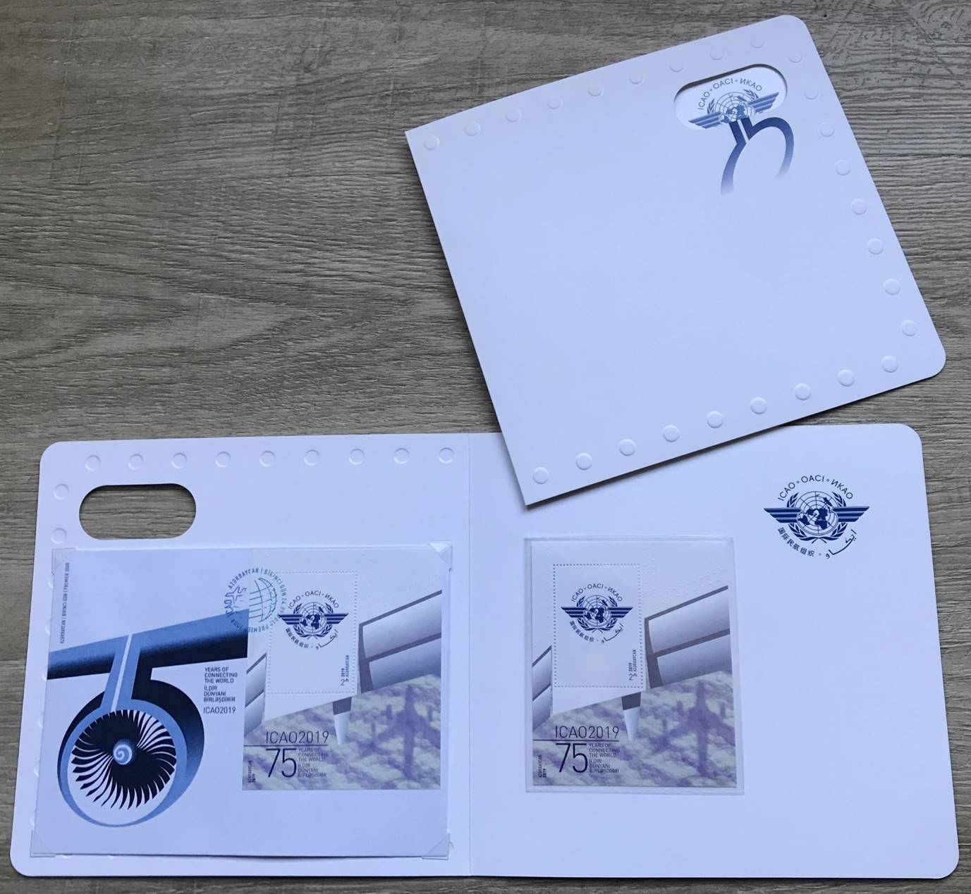 Miniature sheet consisting of a postage stamp with the ICAO emblem and the embossed figure “75”. Stamp size: 37x52 mm. Sheet dimensions: 85x102 mm. The block depicts an airplane wing against a background of clouds; in the lower left corner, the text “ICAO 2019 / 75” is depicted and the text “YEARS OF CONNECTING THE WORLD” is printed in English and Azerbaijani. Particularity of this sheet: The wings of the emblem are used as the horizontal bars of the embossed 7 and 5 digits. This can also be noticed in the presentation folder shown here-after. Print run of 8,000 copies.