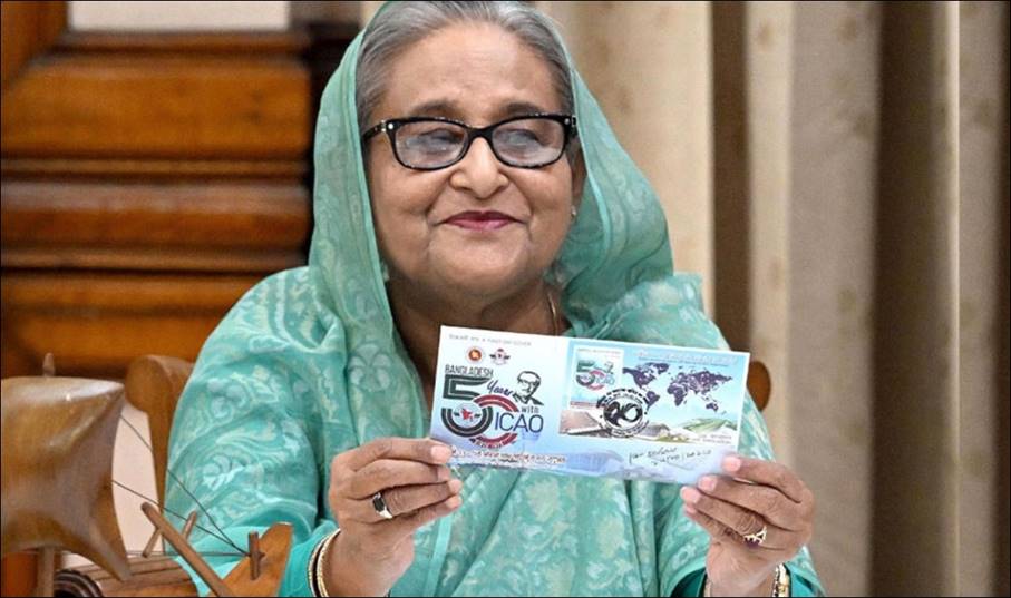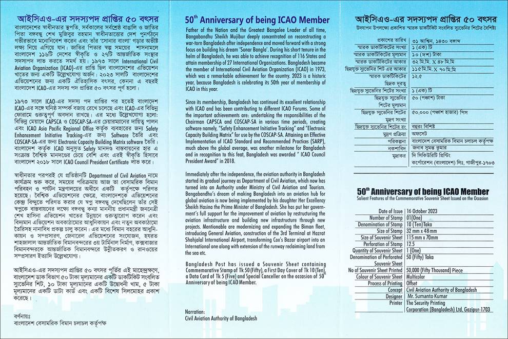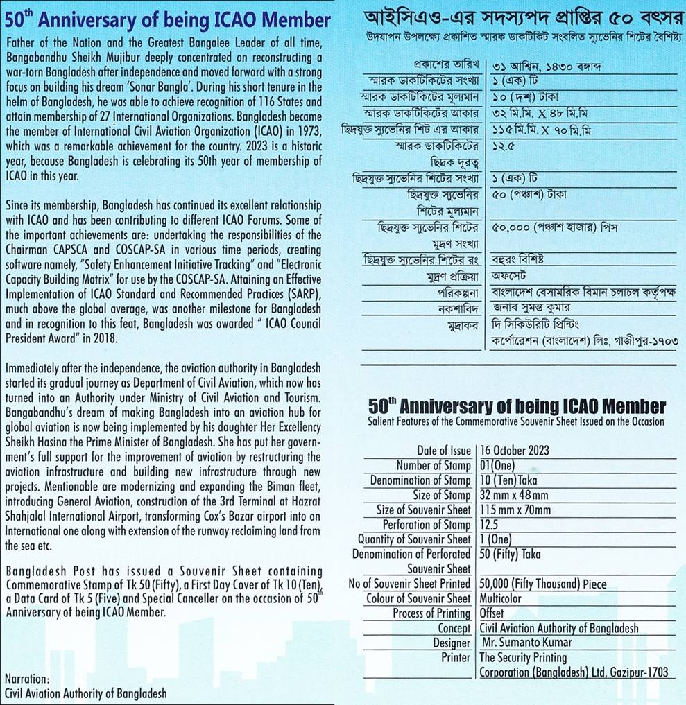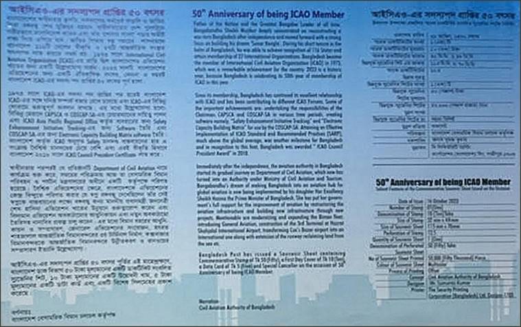 On 16 October 2023, during a ceremony held at the Ganabhaban in the capital of Bangladesh, Prime Minister Sheikh Hasina released a commemorative postage stamp to mark the 50th anniversary of Bangladesh's membership with the International Civil Aviation Organization. It also symbolizes the deep and enduring ties between ICAO and the CAAB. The Ganabhaban is the official residence of the Prime Minister of Bangladesh, which is located on the north corner of the National Parliament House in Sher-e-Bangla Nagar, Dhaka.