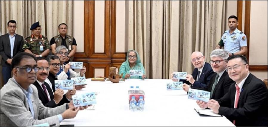 Unveiling ceremony of the stamp and first day covers. In the centre is Prime Minister Sheikh Hasina. To the right of the above (from the back to the front) are: ICAO President, Mr. Salvatore Sciacchitano, ICAO Secretary General, Mr. Juan Carlos Salazar, and ICAO APAC Regional Director, Mr. Tao Ma. To the left of the above (from the back to the front) are: the Minister of Posts & Telecommunications and Information Technology, Mr. Mustafa Jabbar, the State Minister of Civil Aviation and Tourism, Mr. Md Mahbub Ali, the Secretary of the Ministry of Civil Aviation and Tourism, Mr. Md. Mokammel Hossain, and the Chairman of Civil Aviation Authority of Bangladesh, Air Vice Marshal Mr. Md Mafidur Rahman.