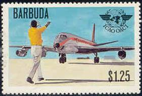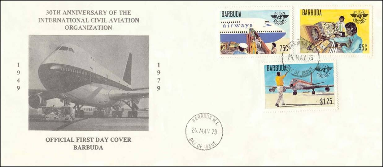 First Day Cover. The cachet pictures a Boeing 747‑200 Jumbo-Jet. Error: This cover seems to commemorate the 30th anniversary of ICAO; the year 1949 does not correspond to any major reference date (such as 1944, 1945 or 1947) from which ICAO anniversaries could be counted. It should have more rightly commemorated the 35th anniversary (1944-1979). More background information on this cover can be found by clicking on: Philatelic Laxity - Barbuda Commemorates ICAO's 30th Anniversary.